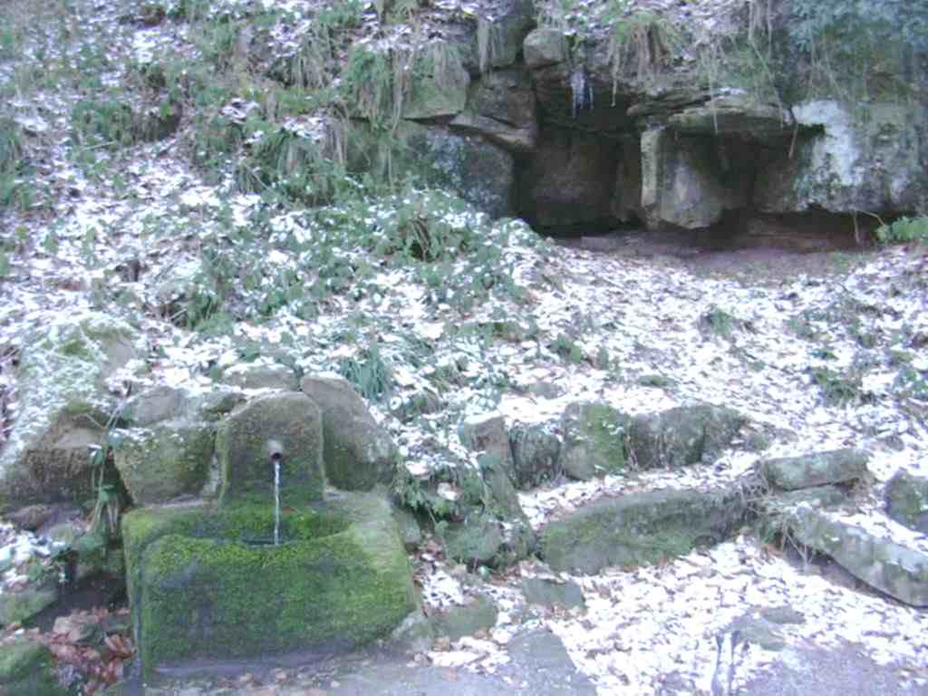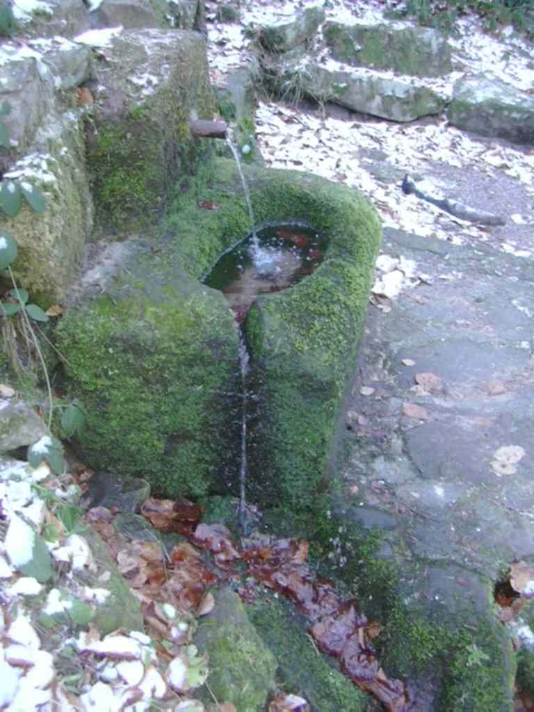 A l'endroit même ou jaillit la source une petite fontaine a été aménagée et l'eau y coule sereinement dans un clapotis enivrant. Vers l'arrière, on aperçoit une sorte d'abri sous roche. On s'attendrait presque à y voir une apparition miraculeuse.... Tout à côté de la fontaine on remarque quelques pierres taillées, sont-elles les vestiges d'une petite bâtisse, d'un aménagement voué à un culte quelconque ? Mystère.
