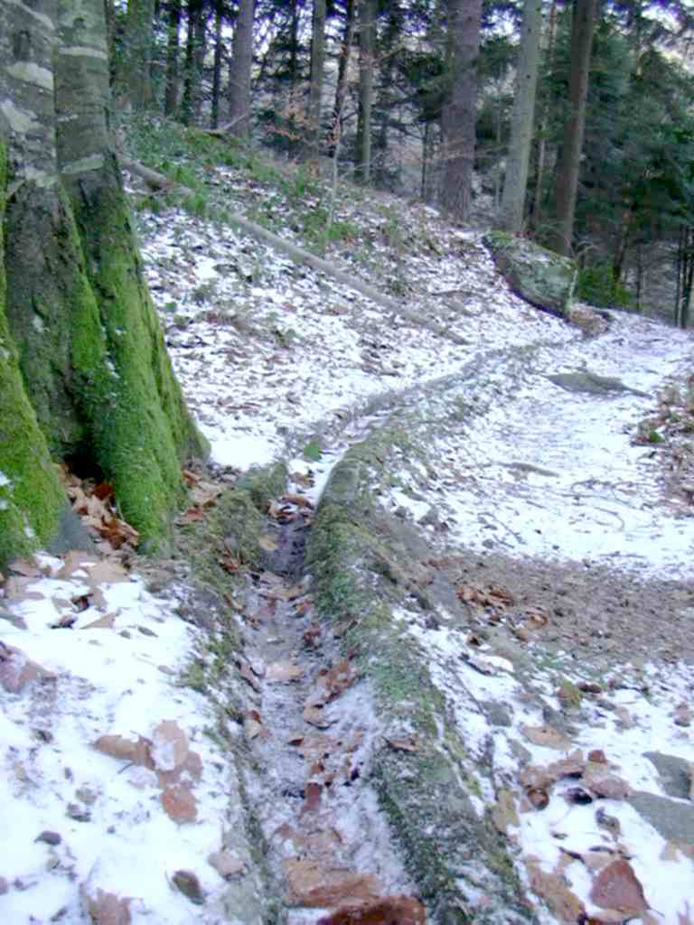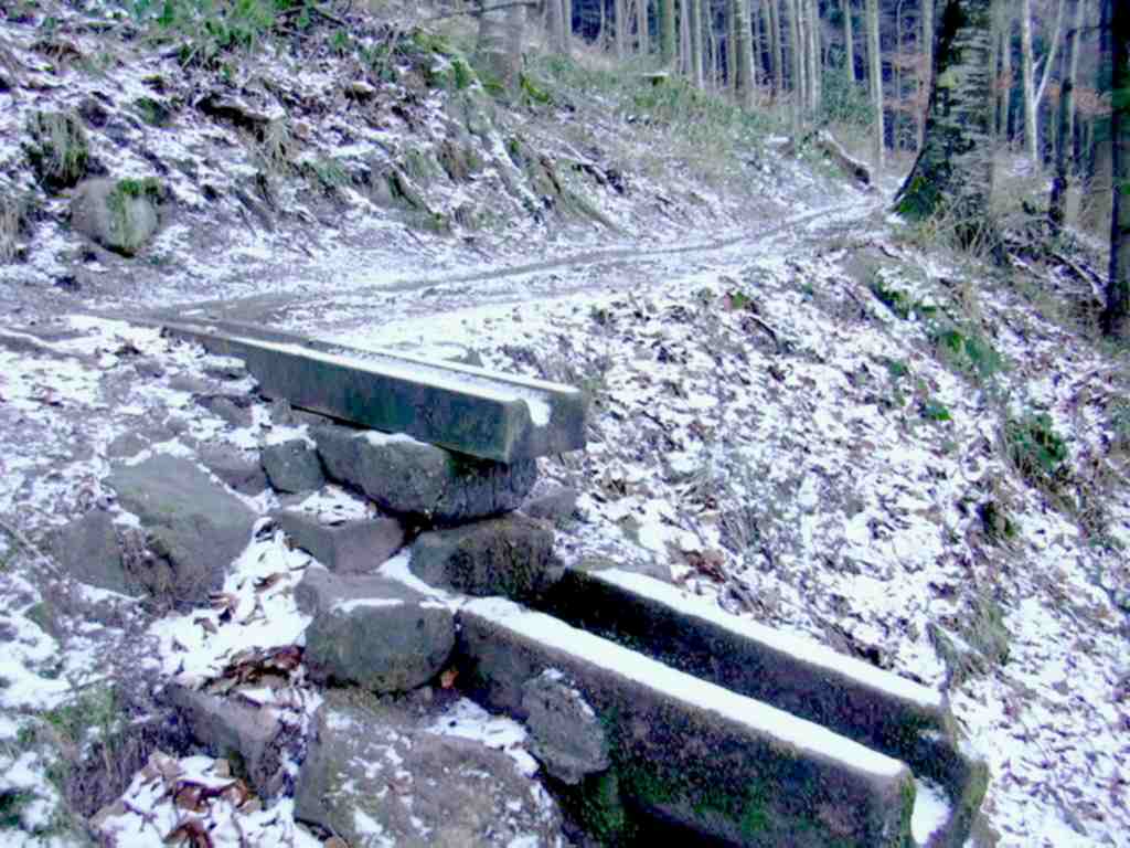 Perdue au fin fond de la forêt sur le versant nord-est du Mont Ste Odile, cette source ne voit pas beaucoup de passants. Pourtant elle mérite un détour car l'endroit est magnifique et très calme. Avant d'accéder à la source on emprunte un petit sentier sur quelques 300 mètres qui est longé par une petite rigole serpentant entre les arbres. Cette canalisation, taillée dans des pierres en grès mis bout à bout, suit le promeneur qui se demande à quoi cela peut bien servir. Elle amène l'eau près d'un grand chemin qui conduit à Saint Nabor. Autrefois cette rigole était destinée à alimenter une fontaine du site de St Gorgon qui marque l'emplacement d'un prieuré de prémontrés, détruit au cours de la guerre de Trente ans. Cette petite fontaine a été déplacée à cet endroit au XIXème siècle par le locataire de chasse (renseignements fournis par M. Guy Trendel). Malheureusement, l'eau n'y coule presque plus car la rigole est encombrée par les feuilles mortes et les jointures entre les différentes pierres ne sont plus étanches.