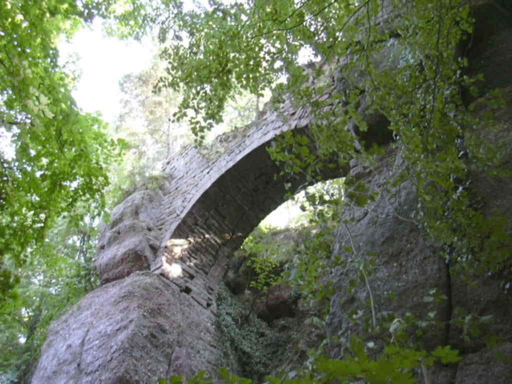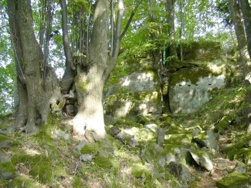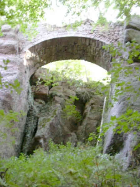 Perdu au fond de la forêt à l'extrémité nord du mur païen, ce château mérite une visite, bien que le site soit dangereux d'accès. Il ne reste plus grand chose des bâtiments. Lorsqu'on grimpe sur le sommet, on peut encore apercevoir un reste d'une tour ou donjon. Mais la partie la plus importante et la plus impressionnante reste quand même la magnifique arche de décharge que l'on peut contempler en faisant le tour du château par le bas. Ce château date probablement du XIIIème siècle et fût construit avec des blocs provenant du mur païen qui passe tout à côté. Les constructeur se sont amplement servi de cette carrière très accessible faisant fi du passé et de l'histoire de cette enceinte. |