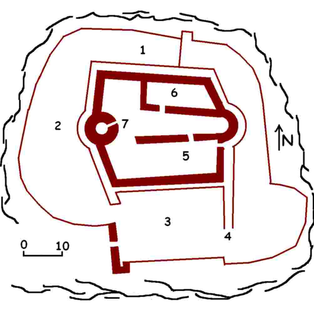 1:face nord - 2:face occidental - 3:esplanade sud - 4:entrée château - 5:parties communes- 6:logis seigneurial - 7:donjon |