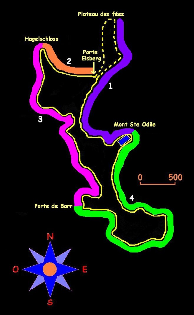Zone 4 : de la porte de Barr au Mt Ste Odile C'est la zone la moins sauvage. On y rencontre quelques rochers remarquables : Wachstein, Maenelstein, la grotte des druides et quelques abris sous roche très intéressants. Sur le côté est, les rochers sont plus rares. |