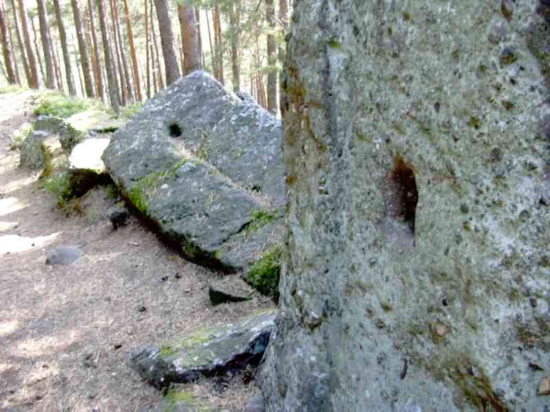 A l'extérieur en longeant le mur on trouve une autre pierre dressée qui semble indiquer une autre porte.Tout le système ressemble fort à une sorte de couloir doublement fermé, un pseudo sas, permettant l'accès à l'intérieur de l'enceinte.Mais quel en était sa fonction, son usage ? Une entrée initiatique, sas de purification avant de pénétrer, check point controlé par quelque garde soucieux de filtrer le passage ? |