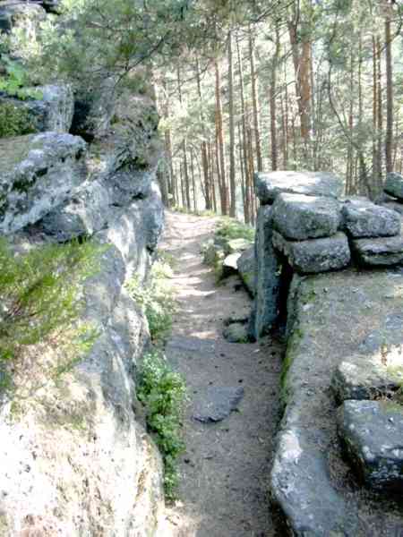 Une porte étroite élaborée par la main de l'homme. Elle fut mise à jour par le professeur Koeberlé en 1877 qui lui a donné son nom. Elle permet un passage restreint d'un seul homme à la fois. On devine encore un montant de porte avec un encoche servant probablement de fermeture pour une porte antique. Une pierre couchée en forme de linteau avec crapaudine témoigne de la structure de cette entrée. | |