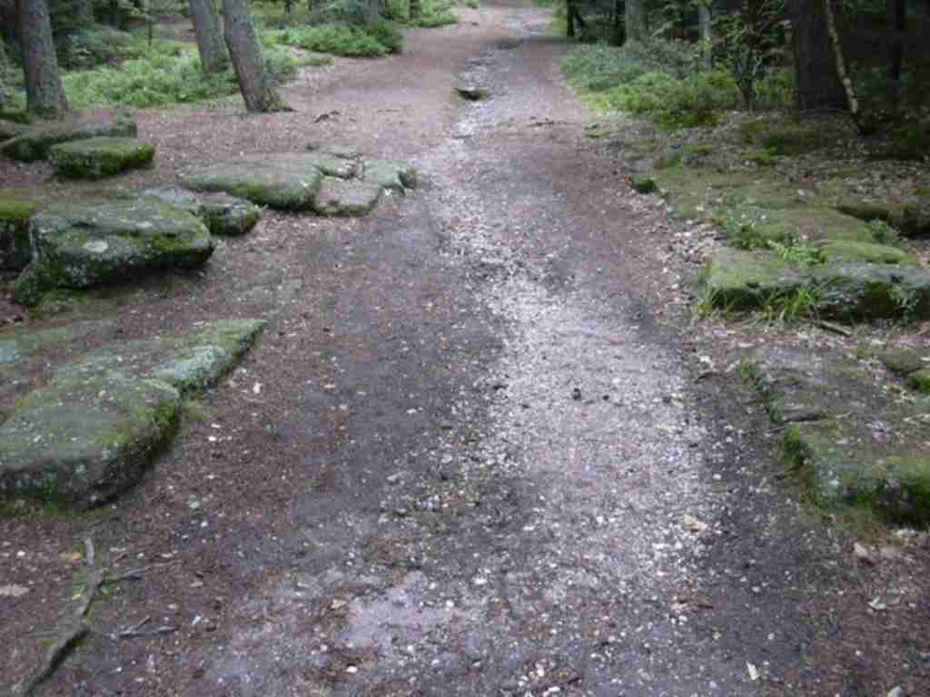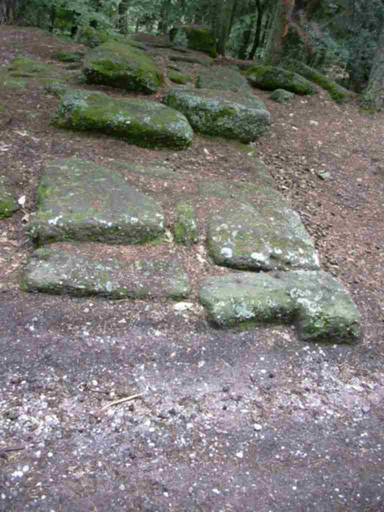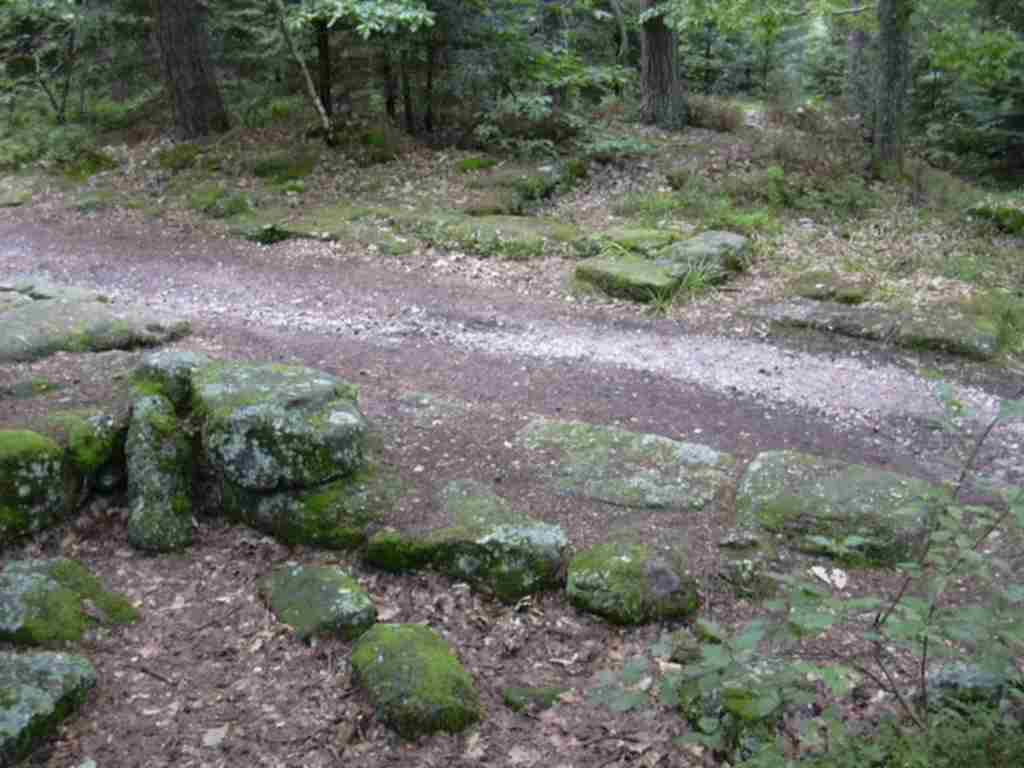 | Cette porte permet le passage du camp central au camp sud. C'est la seule porte existante dans les deux murs transversaux de l'enceinte. A moins qu'un autre passage de même type dans le mur transversal nord permettait le passage du camp central au camp nord. Des fouilles n'ont malheureusement pas permis de mettre en évidence un tel fait. | ||