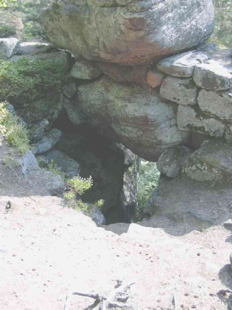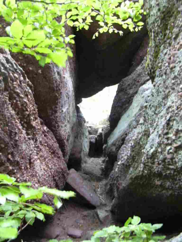 C'est une faille naturelle, surmontée d'un gros rocher, faisant peut-être office de poterne. Le passage est étroit et en forte pente, difficilement pratiquable en venant de l'extérieur. C'est une entrée (si elle a bien été utilisée comme telle) facilement défendable (selon les détracteurs de l'enceinte défensive). On peut penser que cette porte ait été utile pour accéder à une source : celle de la Badstub, située à quelques 200m plus bas dans la montagne. Il est vrai que la surface délimitée par l'enceinte mégalithique manque singulièrement de points d'eau. Cette poterne naturelle pouvant alors servir à s'approvisionner de ce précieux liquide. | ![]() |